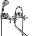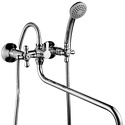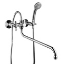 Длина излива - 417, Назначение - Универсальный, Тип - Двухзахватный, Встраиваемый - Нет, Присоединительный размер - 1\2", Термостат - Нет, Поворотный излив - Да, Покрытие - Хром, S-образные эксцентрики - Есть, Донный клапан - Нет, Тип подводки - Жесткая, Цвет - Серебристый, Комплектация - душевой шланг, ручной душ, Материал корпуса - Латунь, Количество монтажных отверстий - 2, Форма излива - Традиционная, Аэратор - Есть, Глубина - 41.7