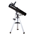 Рефлектор Ньютона на экваториальной монтировке. Данная модель ориентирована на визуальные наблюдения объектов дальнего космоса. В комплект входят окуляры 25 мм и 10 мм. Монтировка снабжена механизмами тонких движений. К алюминиевой треноге крепится лоток для аксессуаров.